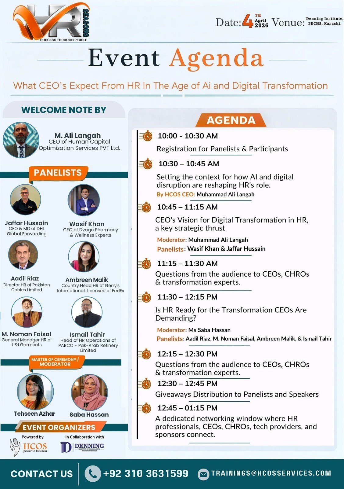 HR SEASONS is a quarterly leadership conversation series designed to bring together CEOs, HR leaders, business heads, policy influencers, and practitioners to discuss how work, people, and organizations are changing. The series goes beyond technology alone it focuses on evolving expectations from HR, leadership priorities, workforce behaviors and demographics, talent mobility and brain drain, pay, inflation, and economic pressures, digital transformation and AI, organizational culture and people strategy. The goal is to create a platform for serious HR dialogue in Pakistan where industry, academia, and practitioners share real experiences instead of theory.